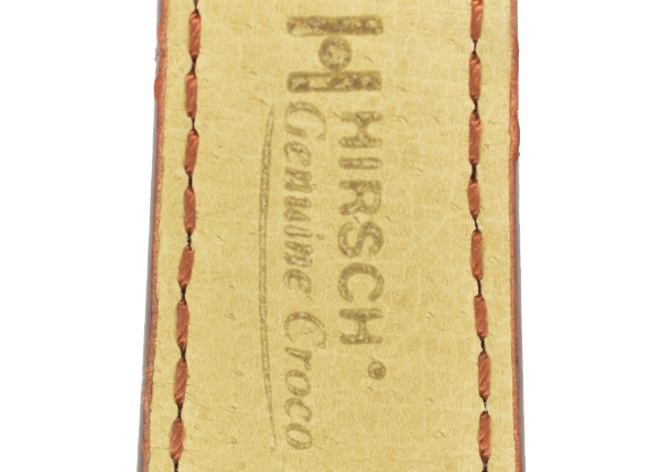 Hirsch 'Genuine Croco' classic shiny brown crocodile skin 20mm leather strap with a gold or steel buckle. The model number is 18920870-1-20. This strap has a 1 year Hirsch warranty.