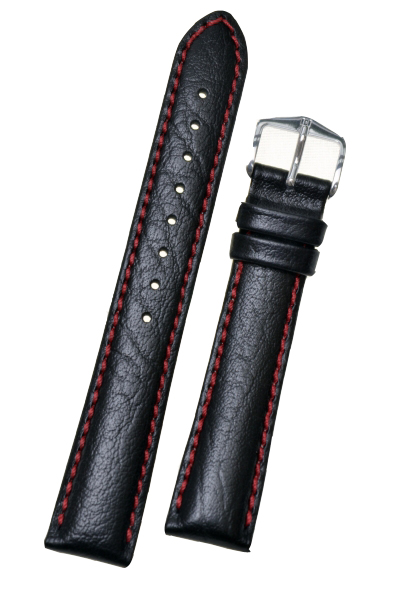 Hirsch 'Jumper' 22mm calfskin black leather watch strap with red stitching. It has either a gold or steel buckle and it has a 1 year Hirsch warranty. The model number is 04402051-2-22.