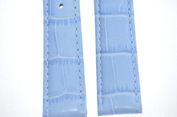 Padded crocodile 16mm light blue leather watch strap. It is available with either a gold or steel buckle.